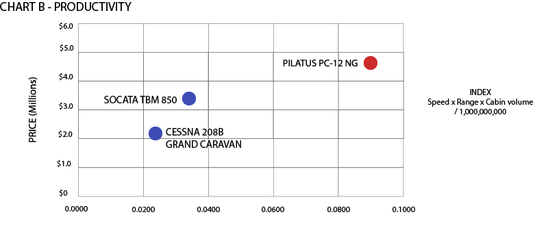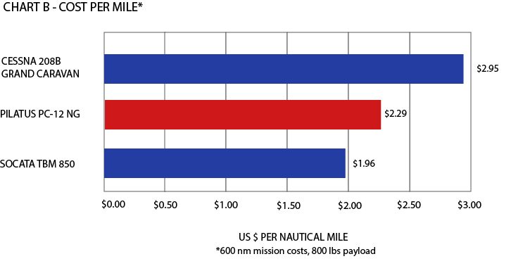 Chart B details “Cost per Mile” comparing the Pilatus to its competition factoring direct costs with other aircrafts. All aircrafts have measured with lying a 600 nautical mile mission with an 800 pound (four passengers) payload. The Pilatus PC-12 NG at $2.29 cost per mile is less than the 208B Grand Caravan ($2.95) but greater than the TBM 850 aircraft ($1.96).