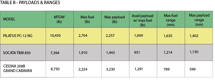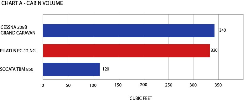 The cabin volume of the Pilatus PC-12 NG (330 cubic feet), is equivalent to the size of the Grand Caravan (340 cu ft) but considerably larger compared with the TBM 850 aircraft (120 cu ft). See Chart A.