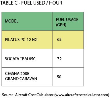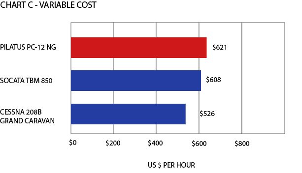 The ”Total Variable Cost” is illustrated in Chart C, which is defined as the cost of Fuel Expense, Maintenance Labor Expense, Scheduled Parts Expense and Miscellaneous trip expense. The total variable cost for the Pilatus PC-12 NG at $621 is more expensive compared to the rest of the field.